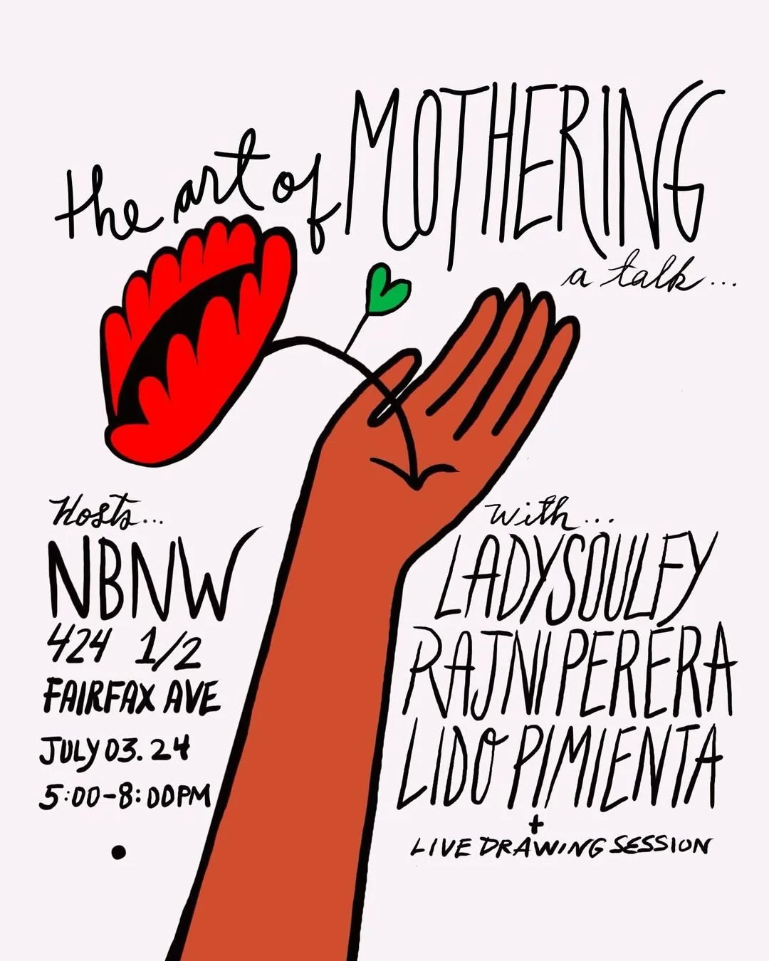 NBNW’s Fairfax Avenue location for a gathering of artists and friends who will share their experiences of the art of mothering while continuing to be creative in a system that seldom considers their divine role as pillars of community. From 5pm to 6pm, join us for a live drawing session by Lido Pimienta (visual artist and composer) and from 7pm to 8pm join a candid convo with Ladysoulfly (sculptor of sublime beauty) Lido Pimienta, and Rajni Perera (painter of galactic diasporic resistance). Hosted and moderated by Mriga Kapadiya of NBNW (gatherer of flowers in the wild).